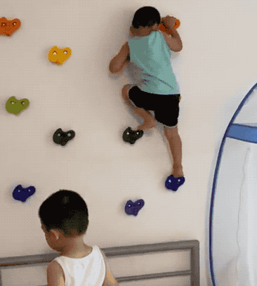 这个攀爬墙也是我们疫情期间新增的游乐设施,对肉丸有一定难度。肉丸以前只会爬上去,不会爬下来,每次都喊大人把他抱下来。这次他居然自己爬下来了。