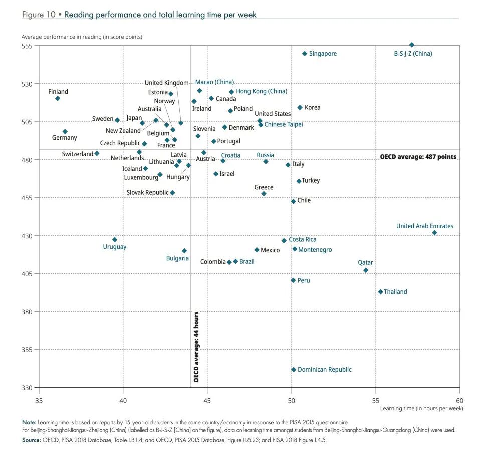 从图表中我们可以看出,中国在最右上角,也就是说我们在成绩顶尖的国家中,孩子是最累的,一个15岁的孩子平均每周学习56个小时以上;而芬兰在最左上角,是成绩顶尖的国家中孩子最轻松的,平均每周仅学习36个小时。