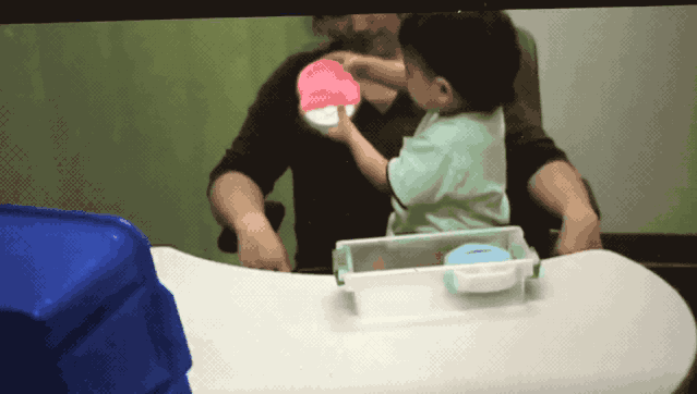 同样的情形在另外一位男宝宝身上也发生了,当没有工作人员注视时,他也同样选择了红色遥控器,并且邀请妈妈一起玩。