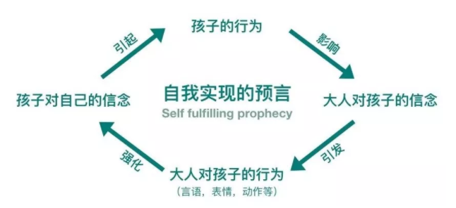 这也就是罗森塔尔提出的——孩子内在的“自我实现的预言”(self fulfilling prophecy)的机制可以对孩子产生期待效应。