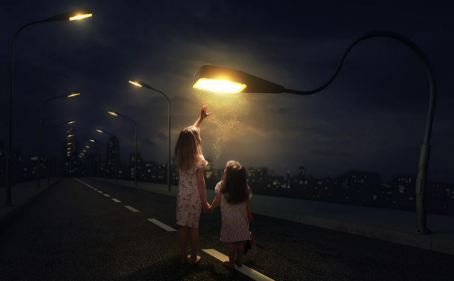当时听来觉得这个说法是错的,但我也没纠正她,一段时间后,我们又散步,她突然指着路灯说:“妈妈,你看像不像怪兽的眼睛?”
