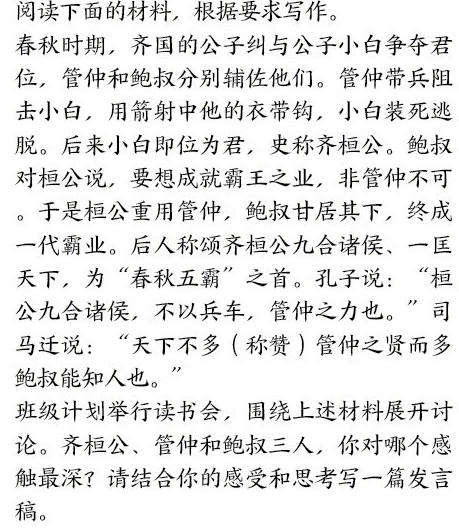 乍一看,好像在考历史知识储备量,因为材料中提到了春秋时期的齐恒公、管仲和鲍叔等人物,还穿插有孔子、司马迁的话。