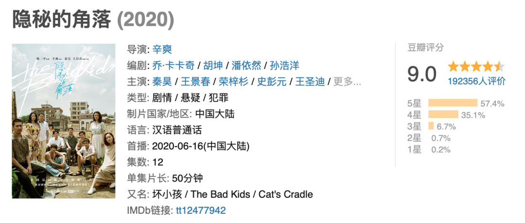 最近,有一部热门新剧——《隐秘的角落》,豆瓣评分9.0,虽然只有12集,却如一匹黑马成为2020年内地评分最高的一部剧。