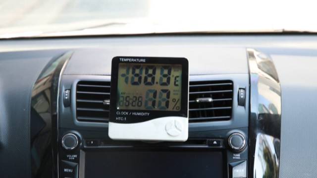 车门关上,温度很快开始升高,坐垫有点发烫,5分钟,车内温度37℃。