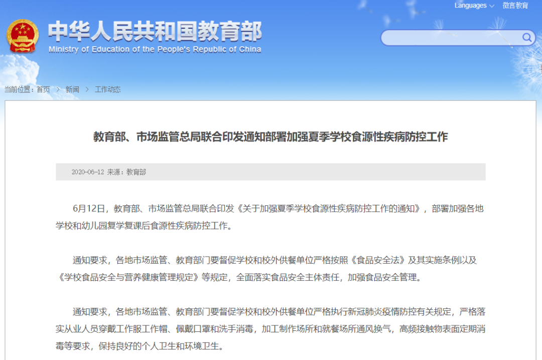 6月12日,教育部、市场监管总局联合印发《关于加强夏季学校食源性疾病防控工作的通知》,部署加强各地学校和幼儿园复学复课后食源性疾病防控工作。