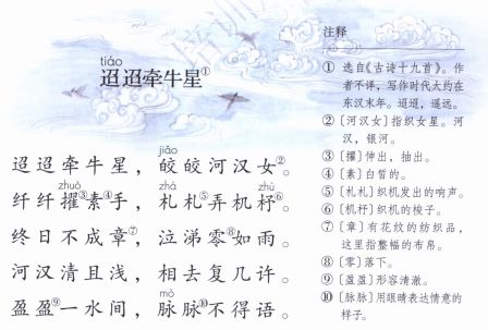 21-22.七夕今宵(xiāo)看碧霄(xiāo),牵牛织女渡河桥。(五上)