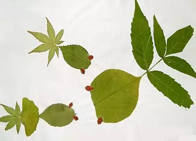 秋天,树叶颜色非常丰富,收集一些带回家,将树叶夹在书页中压干,再准备一些白纸、桨糊。