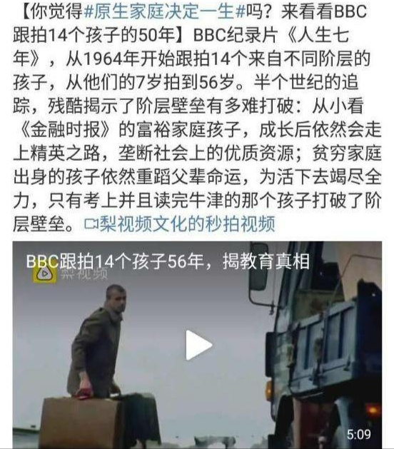 BBC纪录片《人生七年》,从1964年开始跟拍14个来自不同阶层的孩子,从他们的7岁拍到56岁。