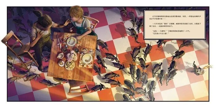 还有扉页上的小男孩手里握着的小喇叭,也是个神奇的小喇叭,在绘本正文很多个不显眼的地方也反复出现;还有一页画面中一角翘起的墙纸和桌子上的一个男人的相框,大象串出来时一张饭桌上的三双碗筷……