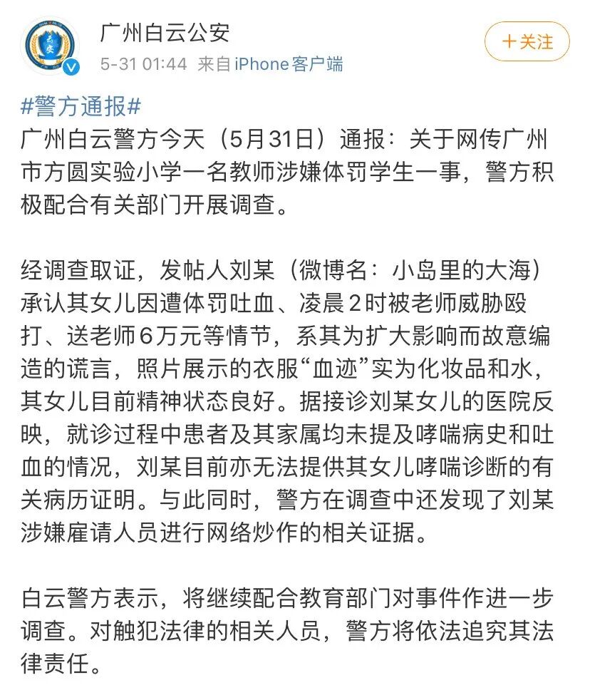 针对网传广州市方圆实验小学一名教师涉嫌体罚学生一事,广州白云公安5月31日凌晨做出通报。