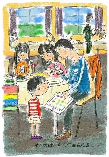 妈妈在忙工作,爸爸在打电话,孩子只是从一个地方换到另一个地方,依然缺少与父母心灵上的交流。