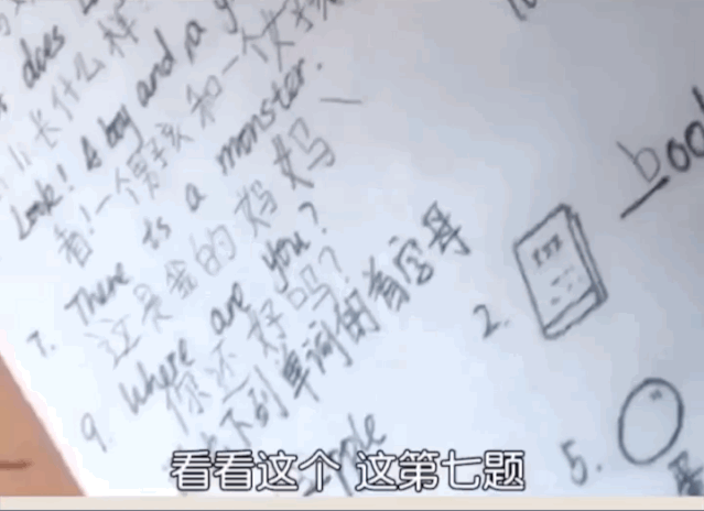 要求翻译「There is a monster.」(这里有个怪物。)孩子写成了:「这是我的妈妈。」