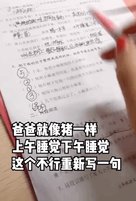 检查作业的时候,看见娃的练习册上写着:「爸爸就像猪一样,上午睡觉下午睡觉。」