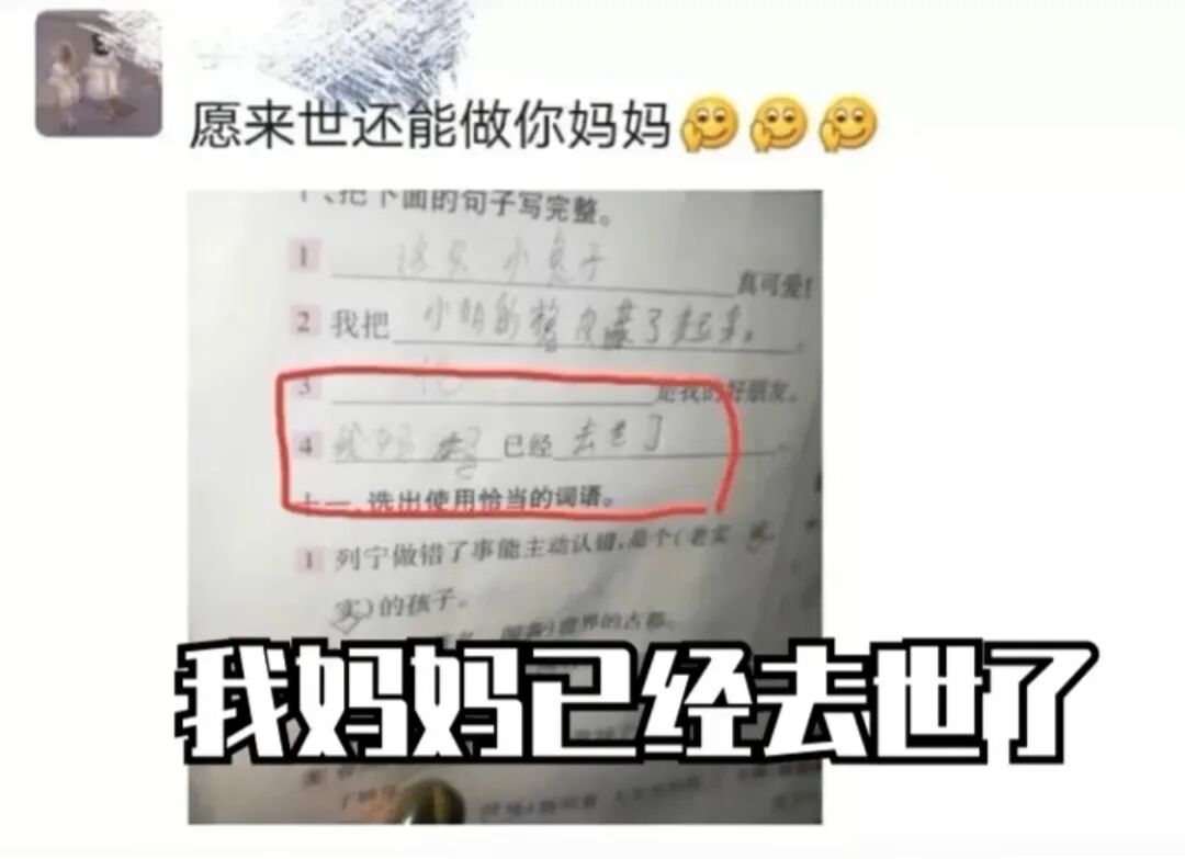要求用「已经」造句,只见娃大笔一挥:「我妈妈已经去世了。」