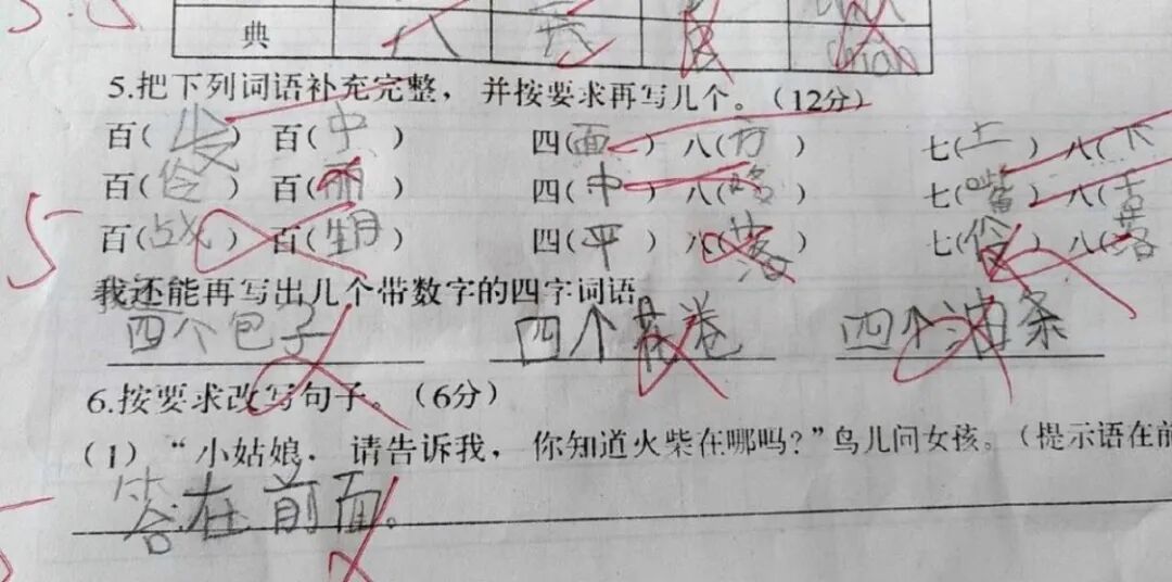 考试要求写几个带数字的四字词语,于是孩子写道:「四个包子」、「四个花卷」、「四个油条。」