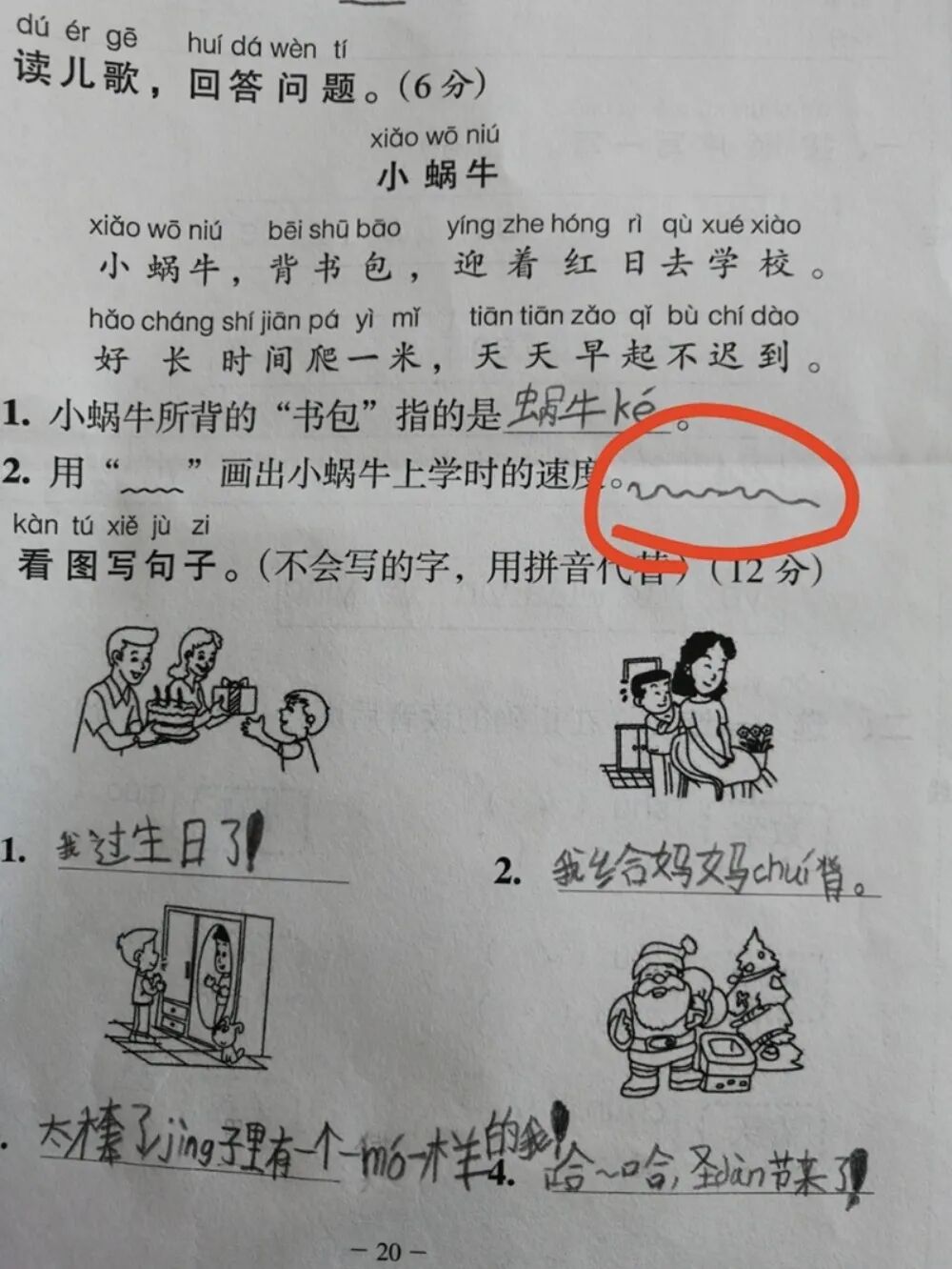 题目要求用波浪线把小蜗牛上学时的速度画出来,这位孩子的答案,绝对是满分啊。