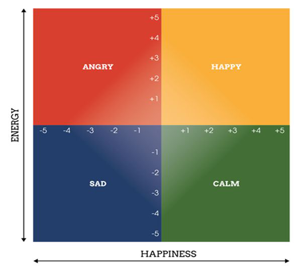 坐标轴根据不同的愉悦度和能量值,用颜色区分了四个象限,红色、蓝色、绿色和黄色。