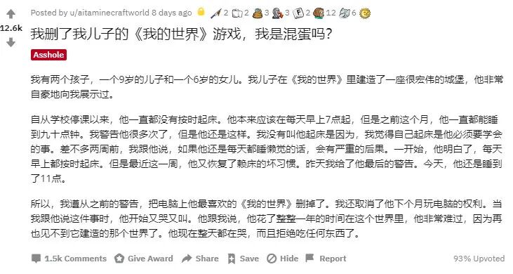 于是他径直走到儿子的电脑前,删掉了他的《我的世界》存档,并且宣布接下来一个月禁止他玩游戏。