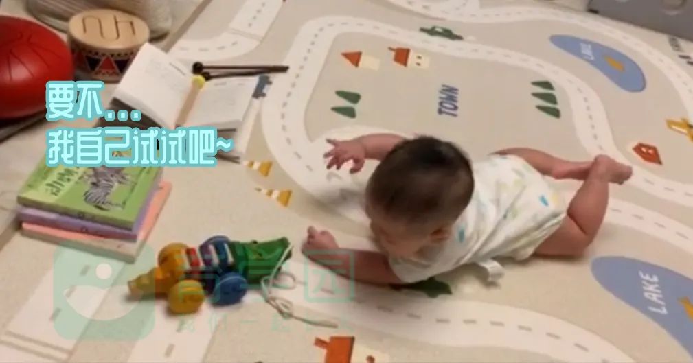 “宝宝继续够绳子的时候,也是一边够一边闹,但就是不放弃。用不屈不挠形容真的不夸张,有种今天不够到不罢休的感觉,最后他还真的连蹬带蹭,自己够到了绳子。”