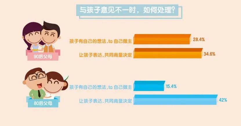 意见不一致时,57.4%的80后父母与63%的90后父母乐意放权给孩子商量决定。