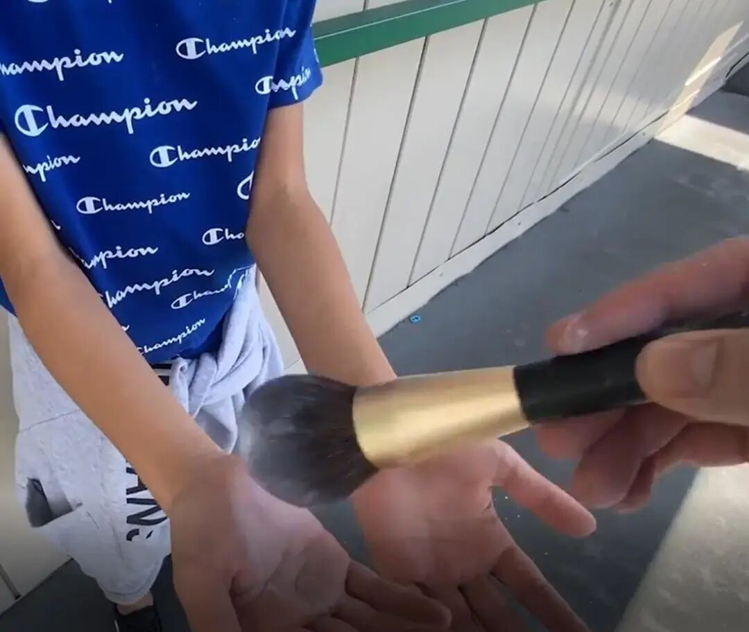 课间休息的时候,马克也随机叫住了一个孩子,将粉末撒在他手上。