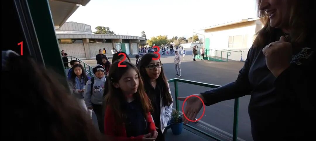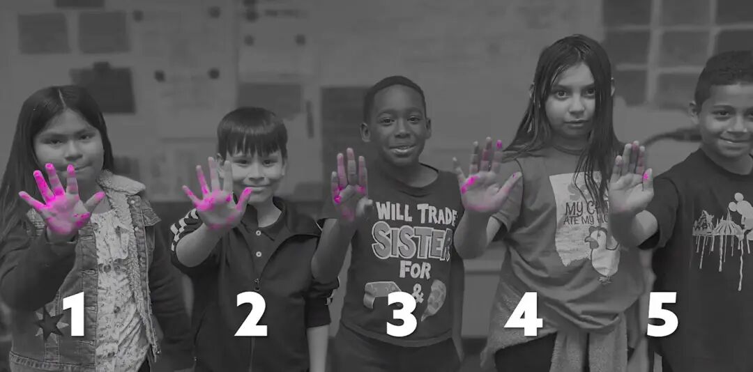 进教室前,在孩子不知道的情况下,老师通过握手的方式,将用来模拟病毒的粉末,“传染”到了3个孩子的手上。