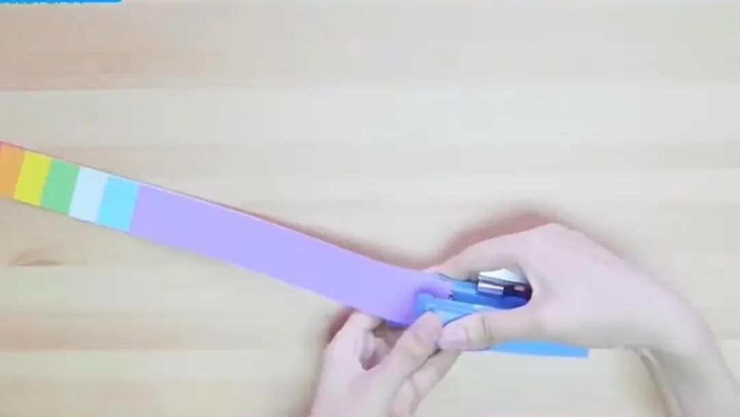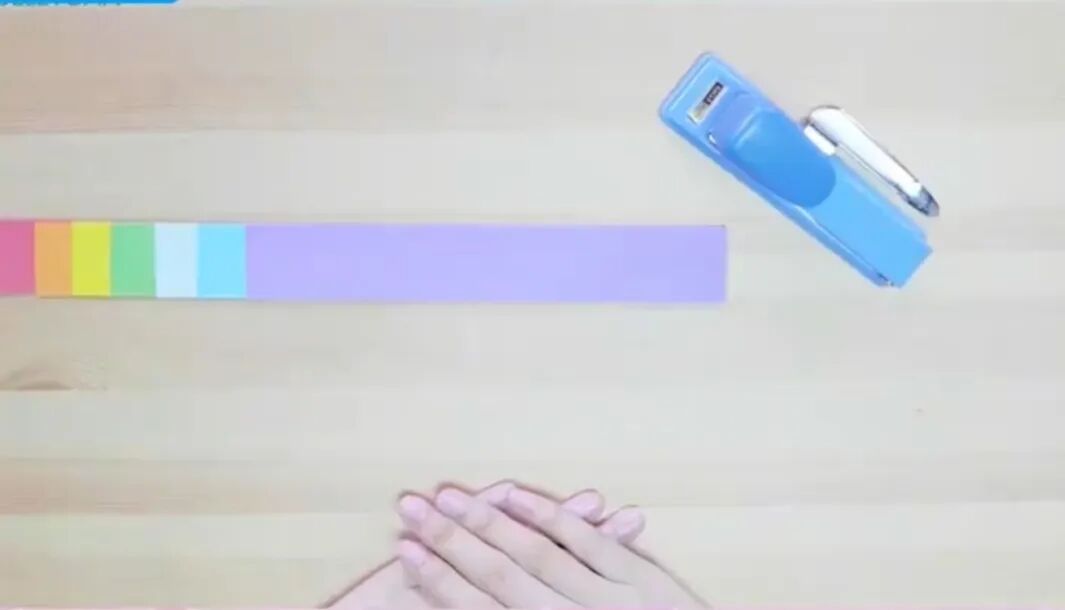 01. 取红、橙、黄、绿、青、蓝、紫7种颜色的纸条,裁成宽度一样,长度渐短的纸条。