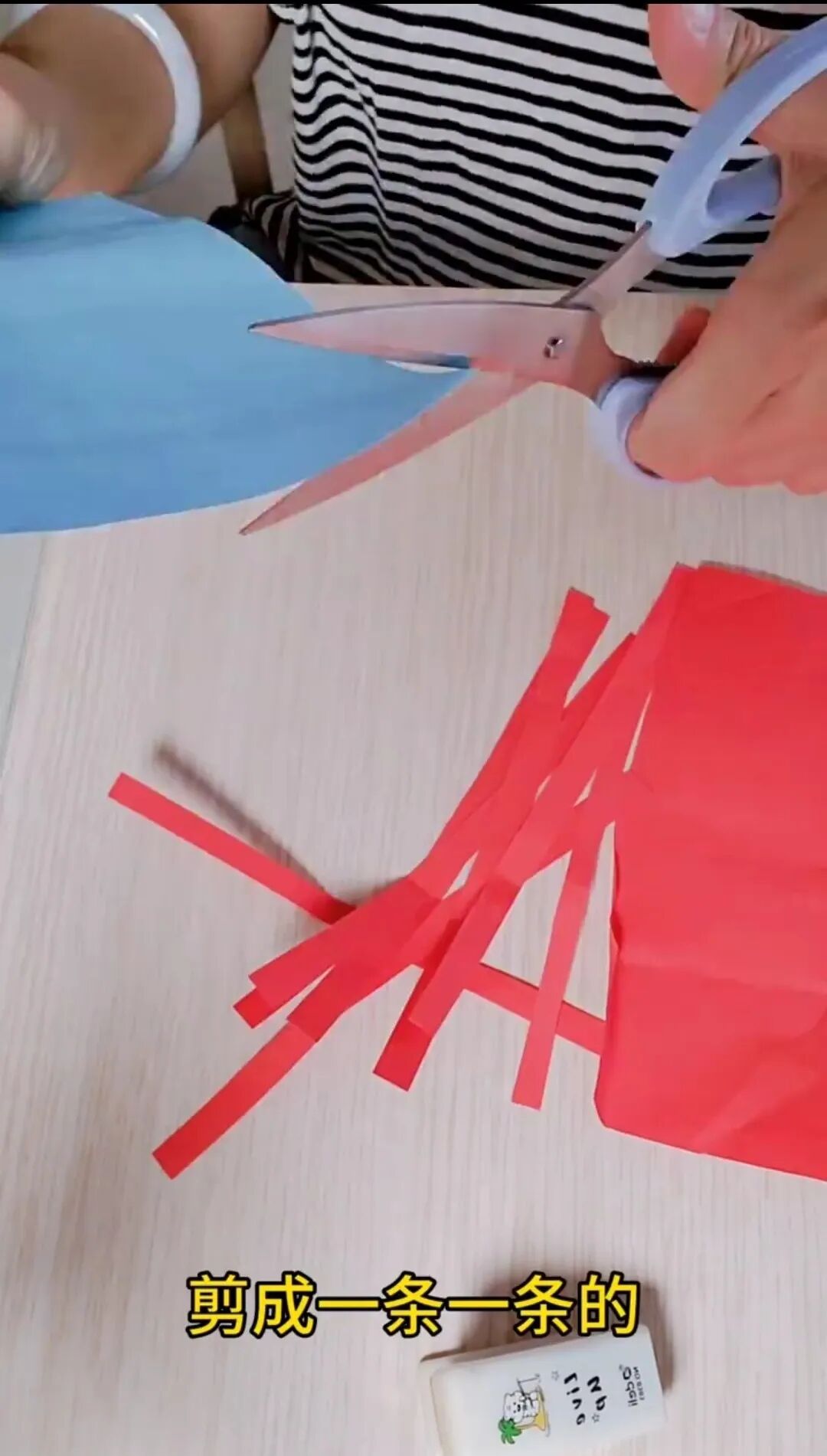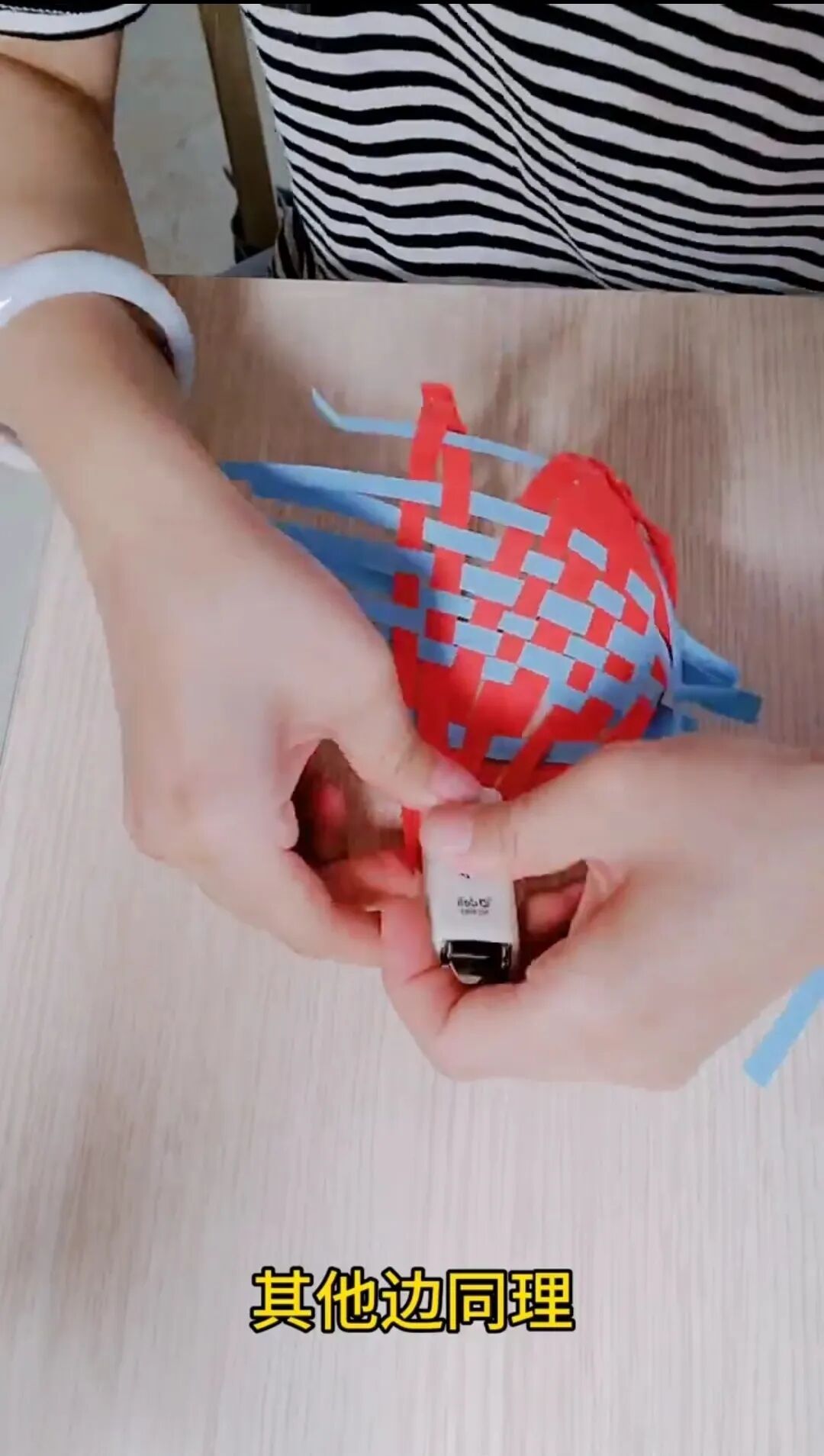 01. 剪刀将彩纸剪成相同长度纸条 ,一上一下交替编织。