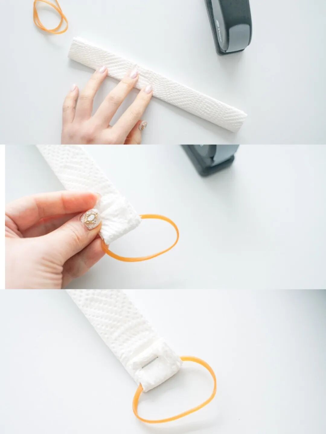 02. 两端对折包住橡皮筋,并用订书机封口。
