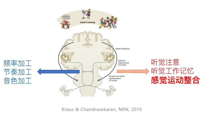 最重要的就是大脑里的「感觉运动整合」。不管是听音乐还是弹奏音乐,都存在着紧密的听觉系统和运动系统的信息整合。