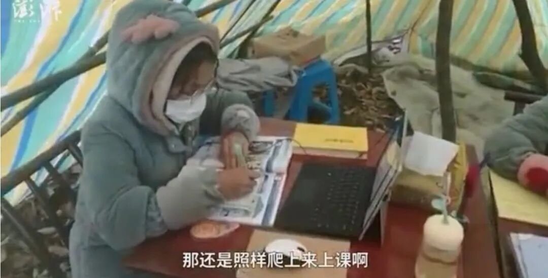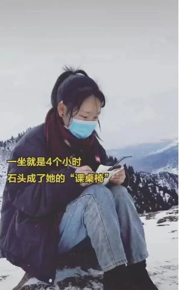 此时的她,坐在零下3℃的雪山上上着网课。