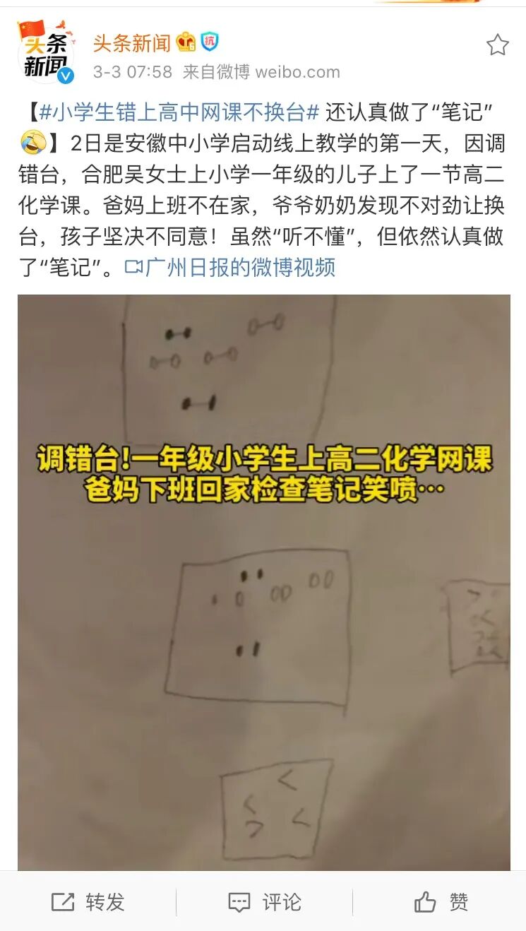 合肥吴女士的儿子刚上小学一年级,网课第一天却因为调错了台,阴差阳错地上了一节高二的化学课。