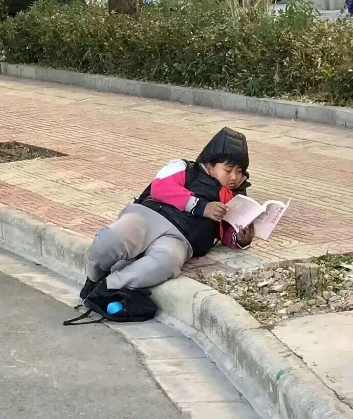 比如,马路牙子上,以某种销魂地姿势,旁若无人,聚精会神看书的小朋友。