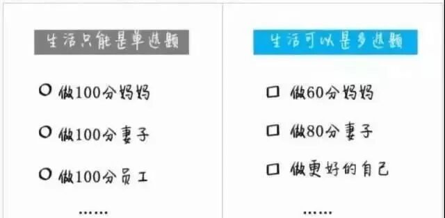 普通父母: 只有一个身份,把生活变成单选题 智慧父母: 灵活调整精力,把生活过成多选题 普通父母总是把生活变成单选题,要么只工作赚钱忽略了孩子,要么只教育孩子忽略了自己。 当工作遇上瓶颈,孩子不听话,就开始心气不顺、焦虑、发脾气。 有智慧的父母,不会故意苛责自己,他们明白世界上没有完美的身份,会把生活过成多选题,在每个阶段都调整好自己的状态,营造温馨愉快的家庭氛围。 别因为孩子,丢了你自己。 当你成为一个身心愉悦、热爱生活的人,你的孩子一定也会有爱心,能够懂得生活的意义。 父母是根,孩子是花。 根的营养不够,花开得不会绚烂。 谁都不是天生的“完美父母”,但教育孩子的路上,必定伴随不断地学习。 你往前迈出的每一小步,都是孩子走向优秀的一大步。