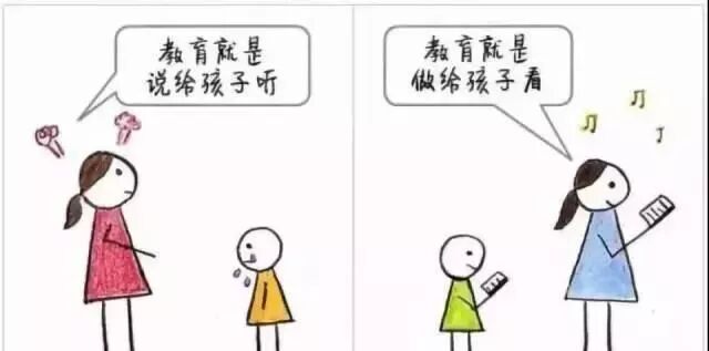 普通父母: 教育就是说给孩子听 智慧父母: 教育就是做给孩子看 马卡连柯在《儿童教育讲座》里说: “不要以为只有你们在同儿童讲话、教育他、命令他的时候才是教育,你们的穿戴、怎样对待朋友和故人,这一切对儿童都是有着那么重要的意义。 ” 普通父母教育孩子,就是跟孩子说很多大道理。 一旦孩子没有做到,就会朝孩子生气、发火,直到孩子发生改变。 感觉自己煞费苦心,最后换来的都是孩子的叛逆和不领情。 智慧父母相信,身教重于言传。 改变孩子之前,先以身作则改变自己,把自己作为榜样,然后潜移默化地影响孩子。 最好的教育不是你说了什么,而是孩子看到了什么。