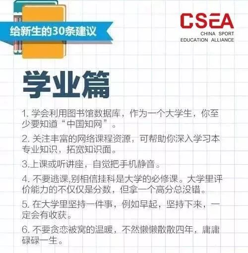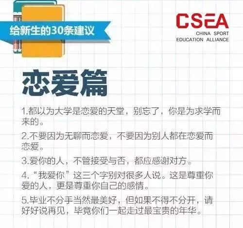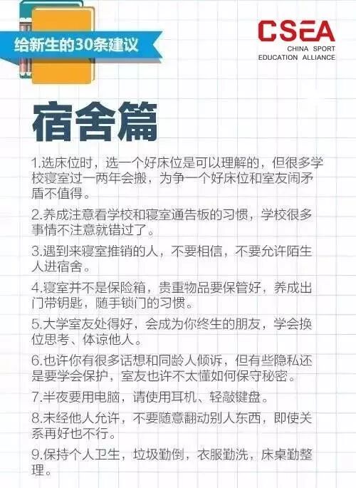 大学时代需要快速独立,很多事情都要自己亲自解决,下面从宿舍、学业、生活、恋爱四方面给大学新生30条建议: