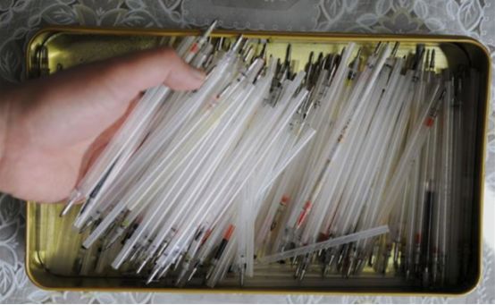 铁盒里是女孩高三一年所有用完的笔芯,整整一盒,两只手都抓不过来。