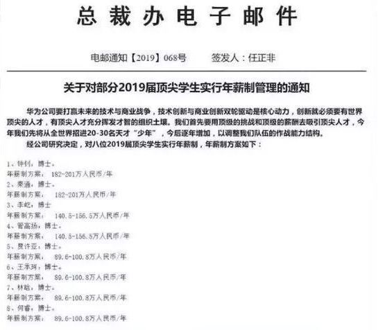 近日,华为总裁办对外公布了一封邮件,邮件内容是2019年华为招收的顶级人才和年薪的通知。