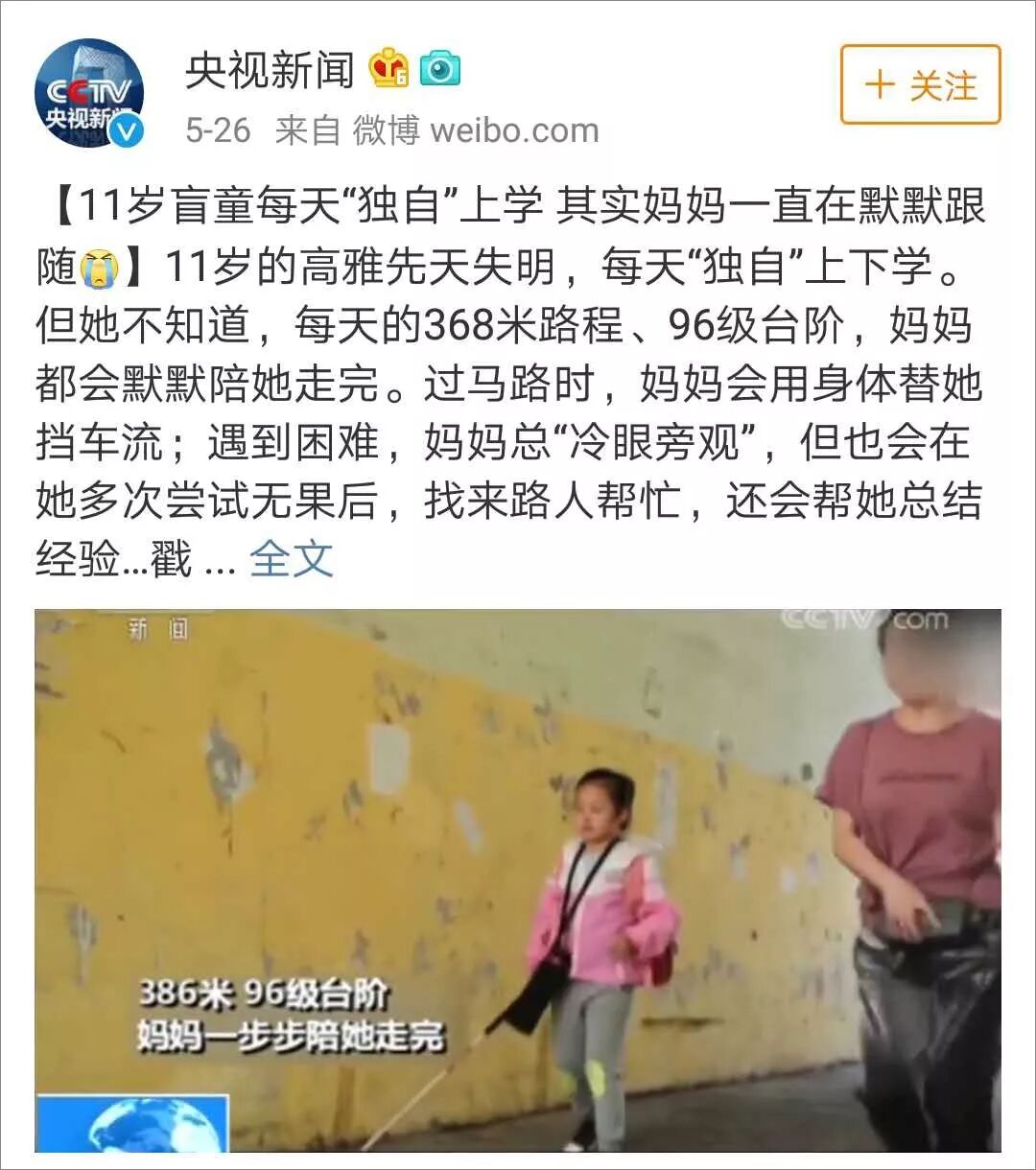 11岁女孩天生失明,可妈妈却让她独自上学。