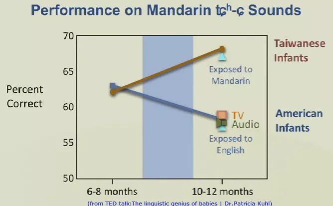 使用视频(TV)和音频(Audio)上课的宝宝,则是和自然学英语的美国宝宝一样,在 2 个月后,对这些中文语音不再敏感(蓝线)。
