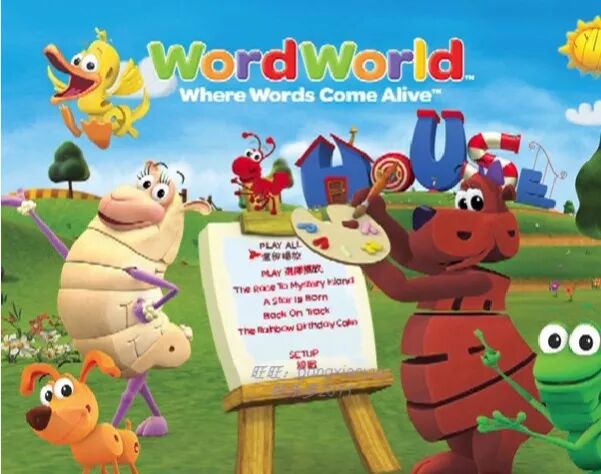 “Word World(单词世界)”是一部用单词字母来展示单词含义的英语启蒙动画片。画面中的所有小动物和物品都是由单词组成的。比如“小蟋蟀”的英文是cricket,所以主角蟋蟀就是完全由这个单词组成,非常有创意。