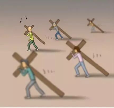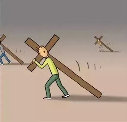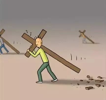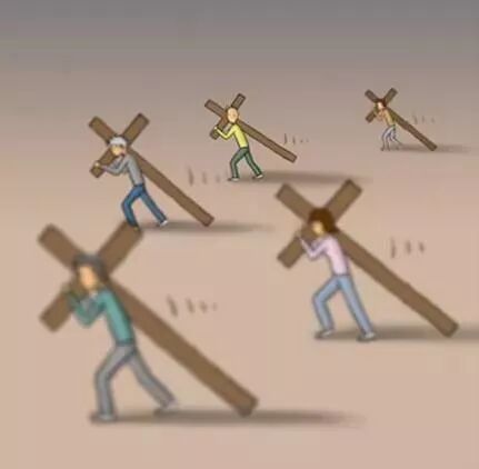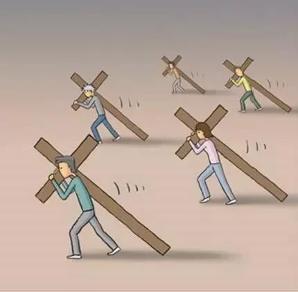 第一幅漫画中,每个人都背负着一个沉重的十字架,在缓慢而艰难地前行!
