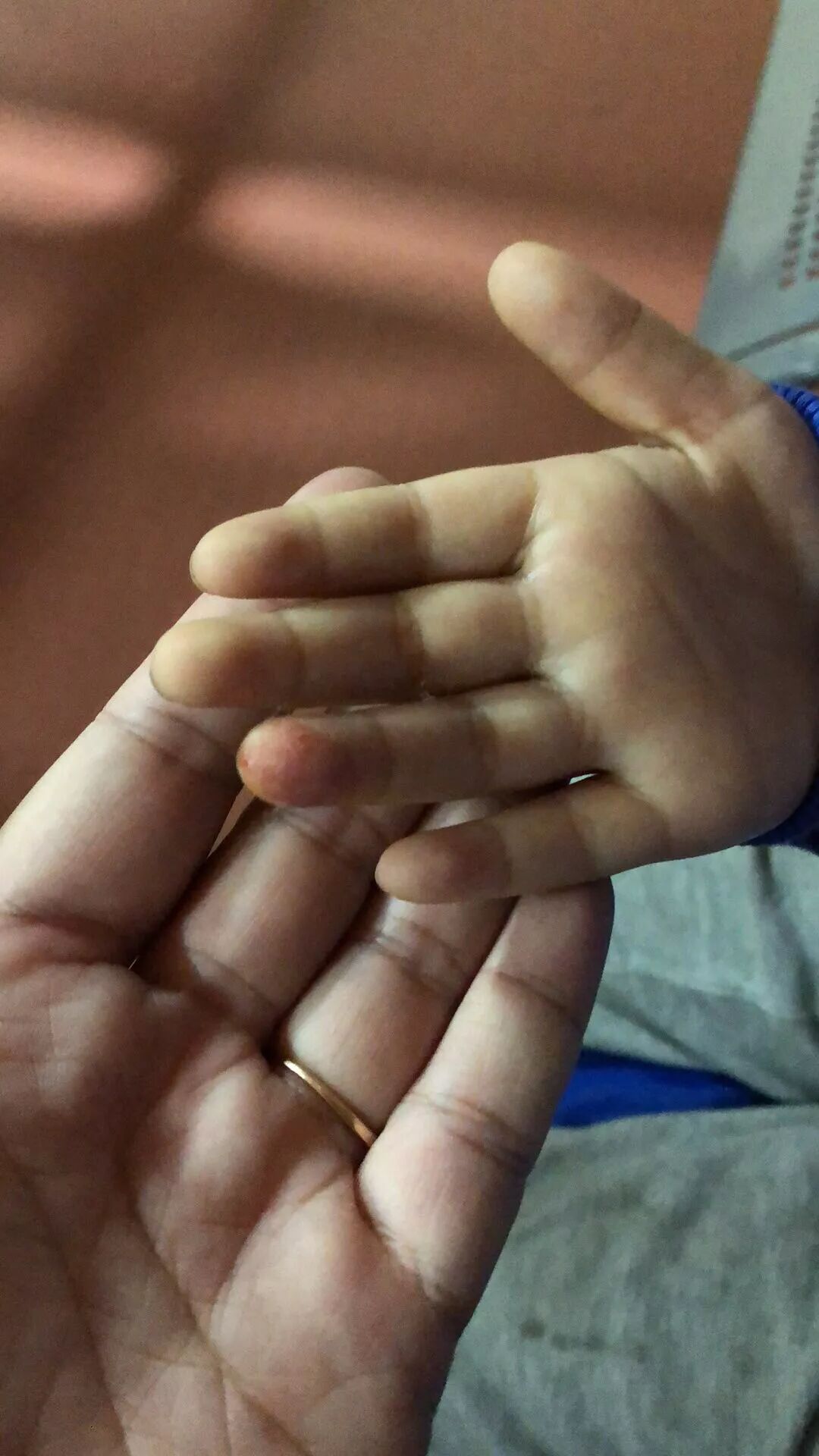 采血,手指上留下了血迹,他给我看。