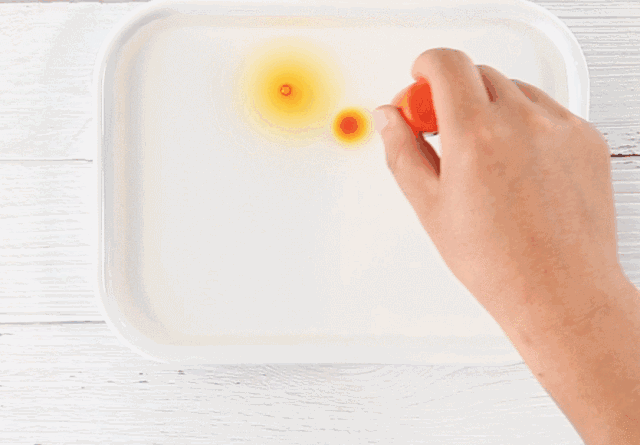 往圆圈中间加水,糖果像是会变魔法一样,形成漂亮的彩虹。