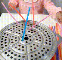 游戏非常简单,准备一个蒸笼及若干个吸管,让孩子用吸管插入蒸笼即可,也可以家长与孩子进行比赛,看谁在规定的时间内插入的最多即为赢家。