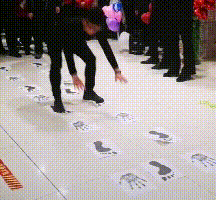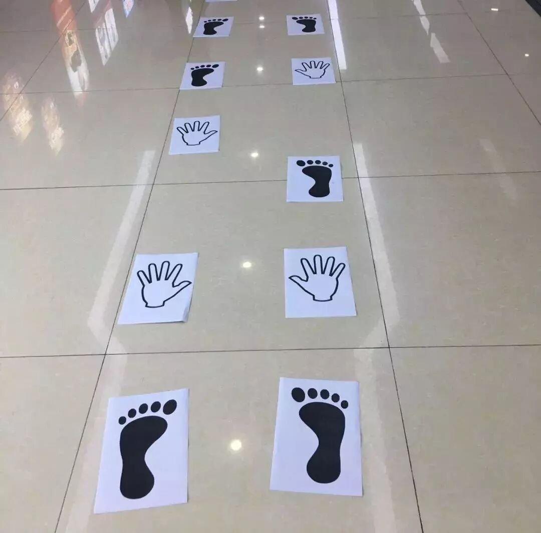 打印一些脚印及手掌印的图片放置在地上,让孩子弯腰手贴地面,身体搭成拱门形状向前行走。