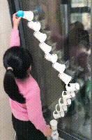 将这些用纸杯剪成的轨道斜着分散着贴到门上,然后把小球从上到下进行滚动,来看看放的位置是否恰好合适。