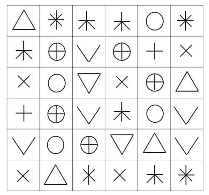 做好之后让孩子看30秒,记住不同形状所在的位置。接着再给孩子一张只有格子没有图案的纸,让孩子把图案画到相应的格子里。