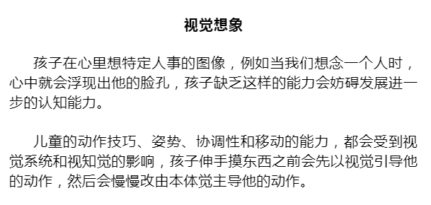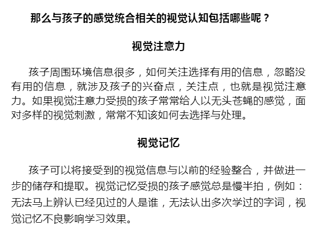 了解了感觉统合之后,我们主要了解一下感觉统合中的视觉刺激,孩子在接受到视觉刺激之后,会根据信息去认知视觉刺激的意义,才会学着去辨认物体脸孔,并学会语言和文字,这就称作视觉认知。