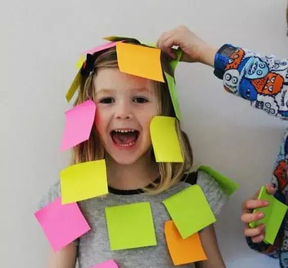 和孩子互相在对方身上贴满便签纸,然后在不依靠任何外力,不用手的情况下,带着孩子一起蹦跳抖动,直到把各自身上的便签纸全部抖落,看谁最先抖干净。